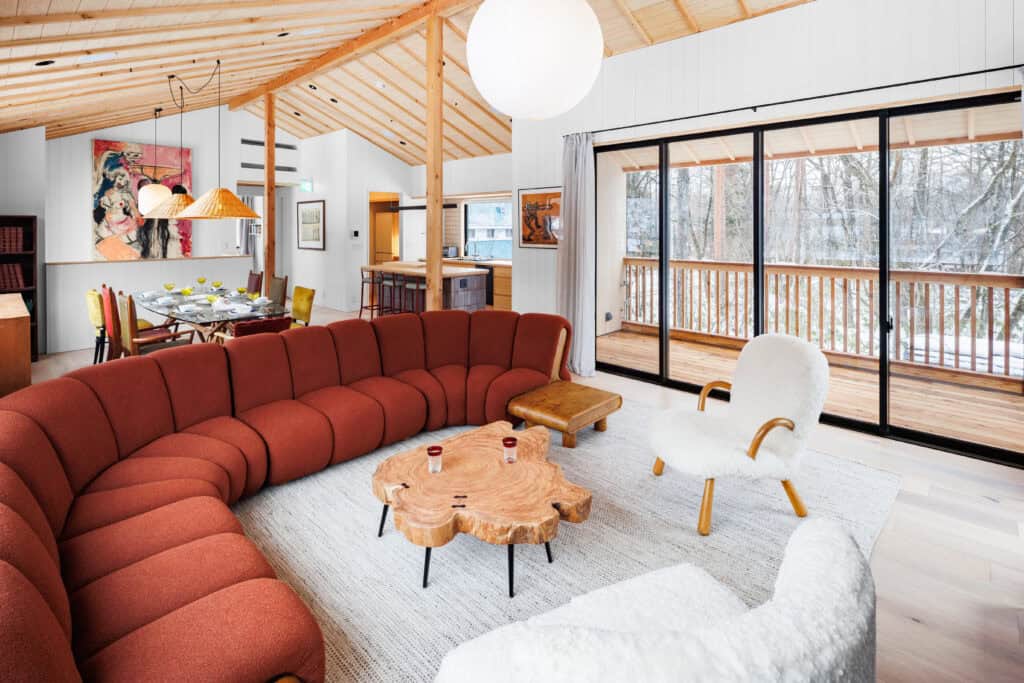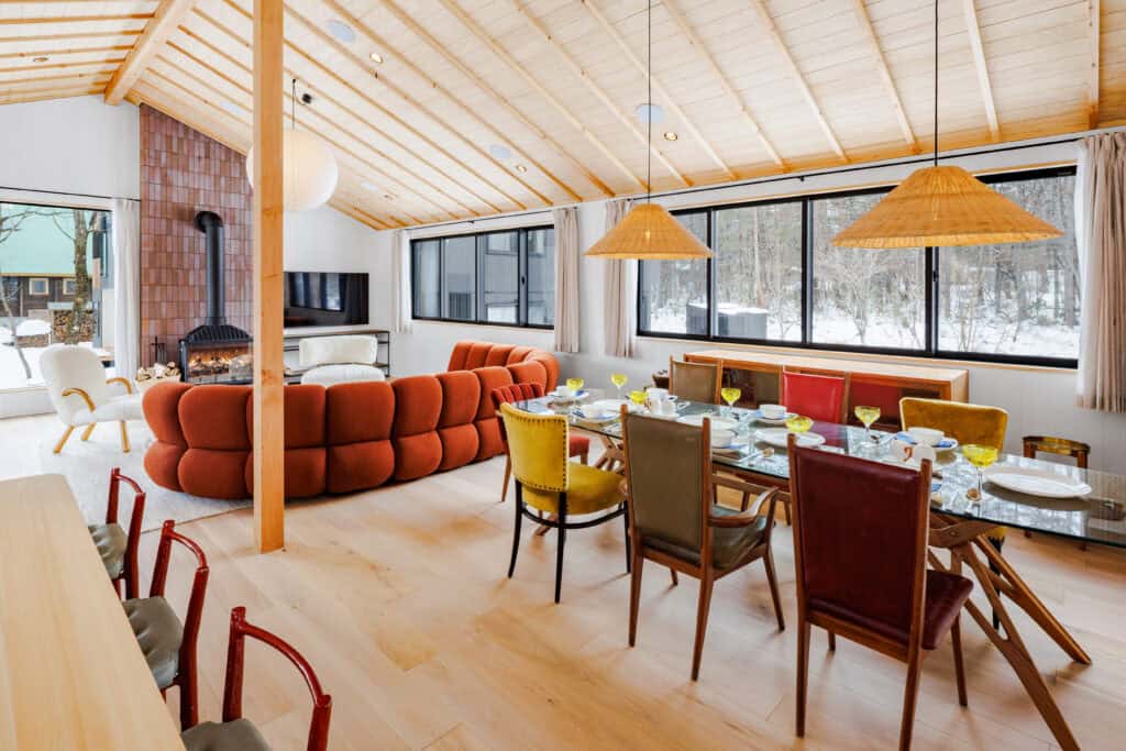 The Boots Off Collection consists of 3 newly built chalets located in Hakuba’s Misorano neighborhood, just a short walk from dozens of bars and restaurants. The first of the collection, Genepi features four bedrooms accommodating up to eight guests, along with three bathrooms. Upstairs guests will find a spacious living and dining area centered around a fireplace, perfect for relaxing after a day on the slopes. Upstairs, guests can enjoy a fully equipped modern kitchen and a covered balcony, perfect for taking in the surrounding forest year round.